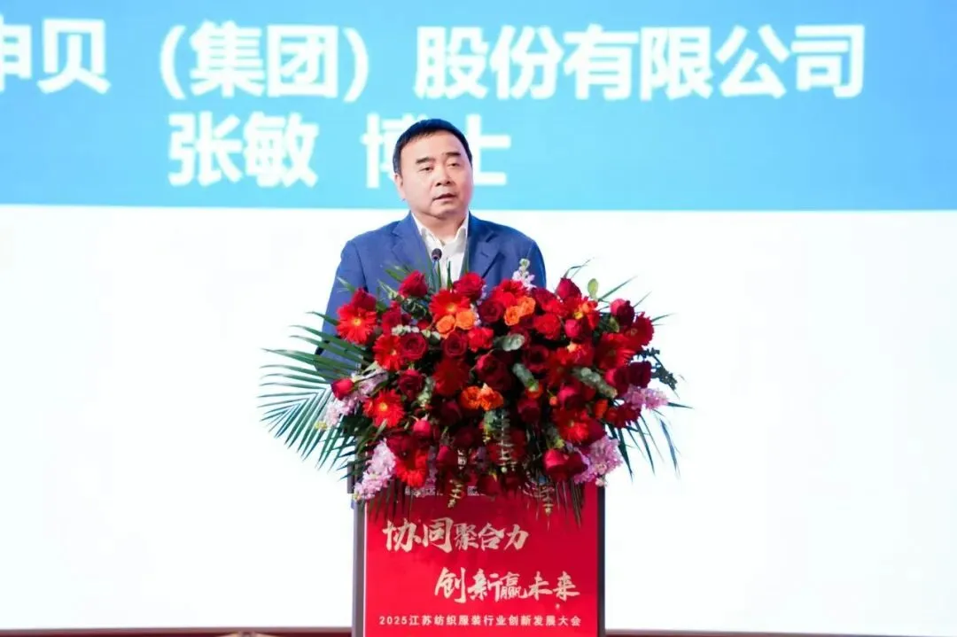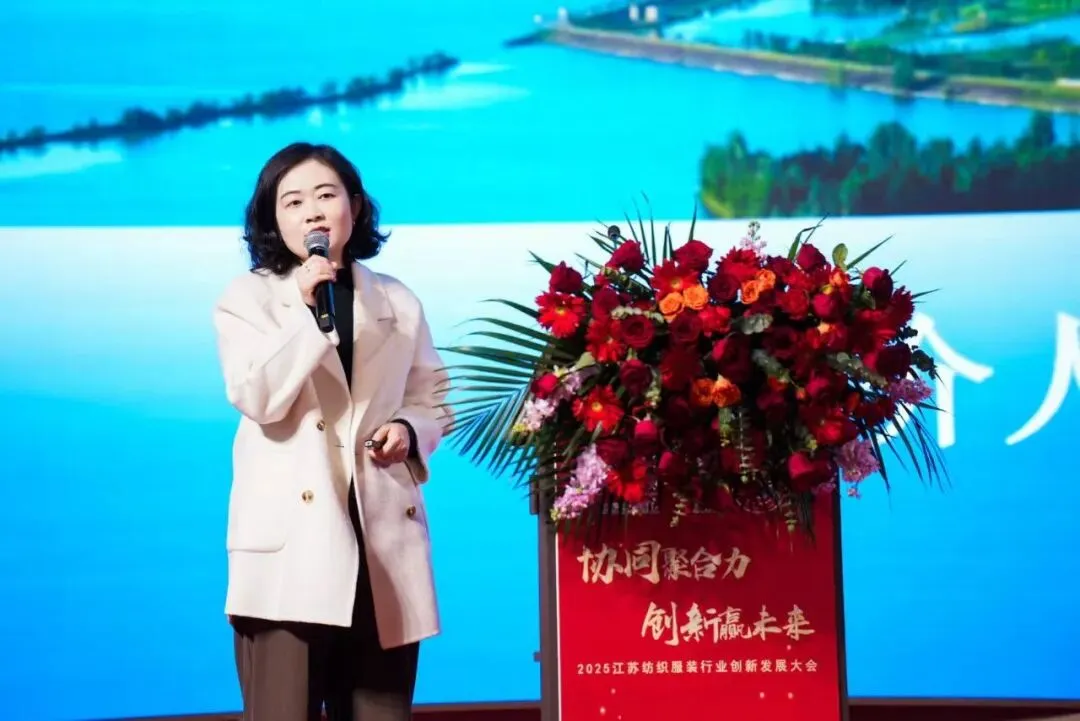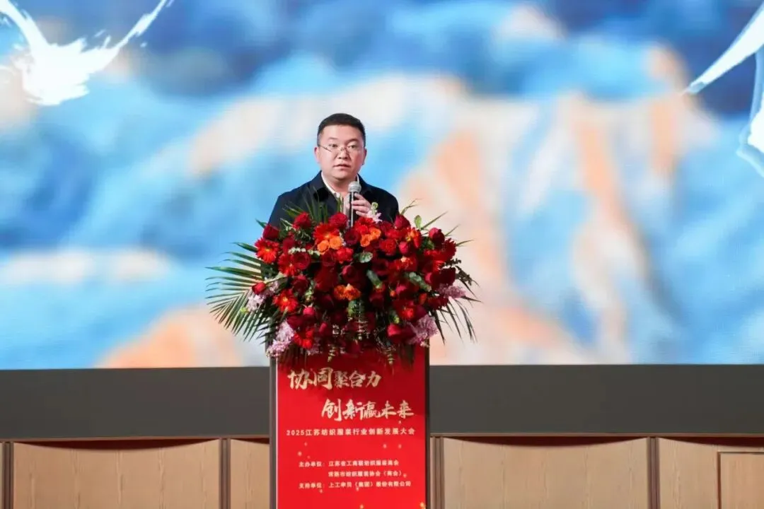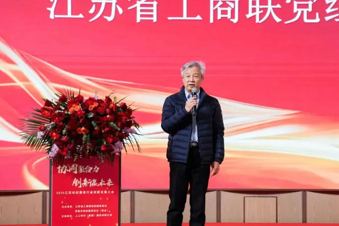 1 月 18 日,由江苏省工商联纺织服装商会、常熟市纺织服装协会(商会)共同主办,上工申贝(集团)股份有限公司支持的2025江苏纺织服装行业创新发展大会在常熟昆承湖凯悦酒店隆重举行。本次大会以“协同聚合力 创新赢未来” 为主题,汇聚了行业领导、专家学者、知名企业家等各界代表,共话产业转型新路径,共谋高质量发展新篇章。江苏省工商联党组成员、副主席吴卫东,全国工商联纺织服装商会理事长高德康,苏州市委统战部副部长、工商联党组书记王蓓蕾,常熟市工信局党组书记、局长钱韧,江苏省工商联纺织服装商会会长、常熟市纺织服装协会(商会)会长、波司登股份有限公司董事长高晓东,全联纺织服装业商会秘书长朱钧,商会副会长、苏州市服装商会会长、江苏特别特服装有限公司董事长陈斌,上工申贝集团董事长兼总裁张敏,共青城高新区管委会副主任卢凌,新疆温宿县产业园区主任申华,江苏省纺织产品质量监督检验研究院院长张彤,常州纺织服装职业技术学院服装学院院长袁红萍,上海市合成纤维研究所原所长、天祥集团(Intertek)顾问王建平,安徽宿州学院服装版型研发中心主任朱海鸥,第三届职业技能大赛服装制版项目裁判员、江苏乡土人才、江苏技术能手邢汉芝等领导嘉宾出席大会。纺织服装行业重点品牌企业上工申贝集团董事长兼总裁张敏,商会副会长、华瑞时尚集团有限公司董事长孙家军,江苏苏美达轻纺国际贸易有限公司副总经理杨志勇、雅鹿集团股份有限公司副总裁刘云,苏豪时尚集团党委委员刘佳琦、商会副会长、江苏金岛服饰集团有限公司董事长林文,商会副会长江苏三周服装有限公司董事长邵海建,希音(SHEIN)产业带负责人邵晨,元鹏新产业跨境电商运营负责人李昊旻,上工申贝集团常务副总裁、工业机事业部总经理李晓峰等品牌企业相关负责人也出席了会议,同时出席会议的还有江苏省工商联纺织服装商会副会长李超、葛沈庄、丁健、孙茂军、范松、黄火忠、周宏亮,副会长兼秘书长陆梅、监事王有明、副会长单位代表及江苏省体育装备协会副会长仝大伟、南京服装行业协会秘书长钟乐民、苏州市户外运动服装产业联合会秘书长施人蛟、无锡市纺织工业协会副秘书长刘巍等纺织服装兄弟商协会负责人和江苏省工商联纺织服装商会、常熟市纺织服装协(商)会会员企业近300人参加大会。