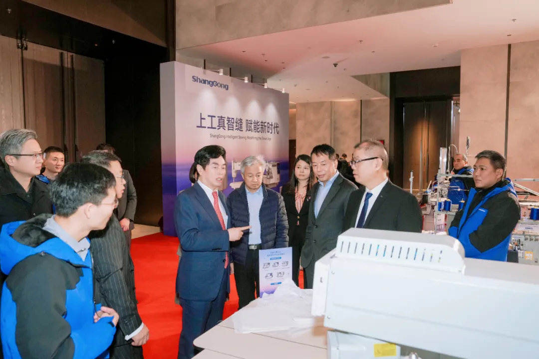 在高晓东会长带领下,与会领导嘉宾和会员企业参观了智能化缝制设备展示。此次由上工申贝(集团)股份有限公司带来的多款智能化缝制设备融合了前沿数字技术与工业设计,在提升生产效率、优化缝制精度、降低人工成本等方面展现显著优势。