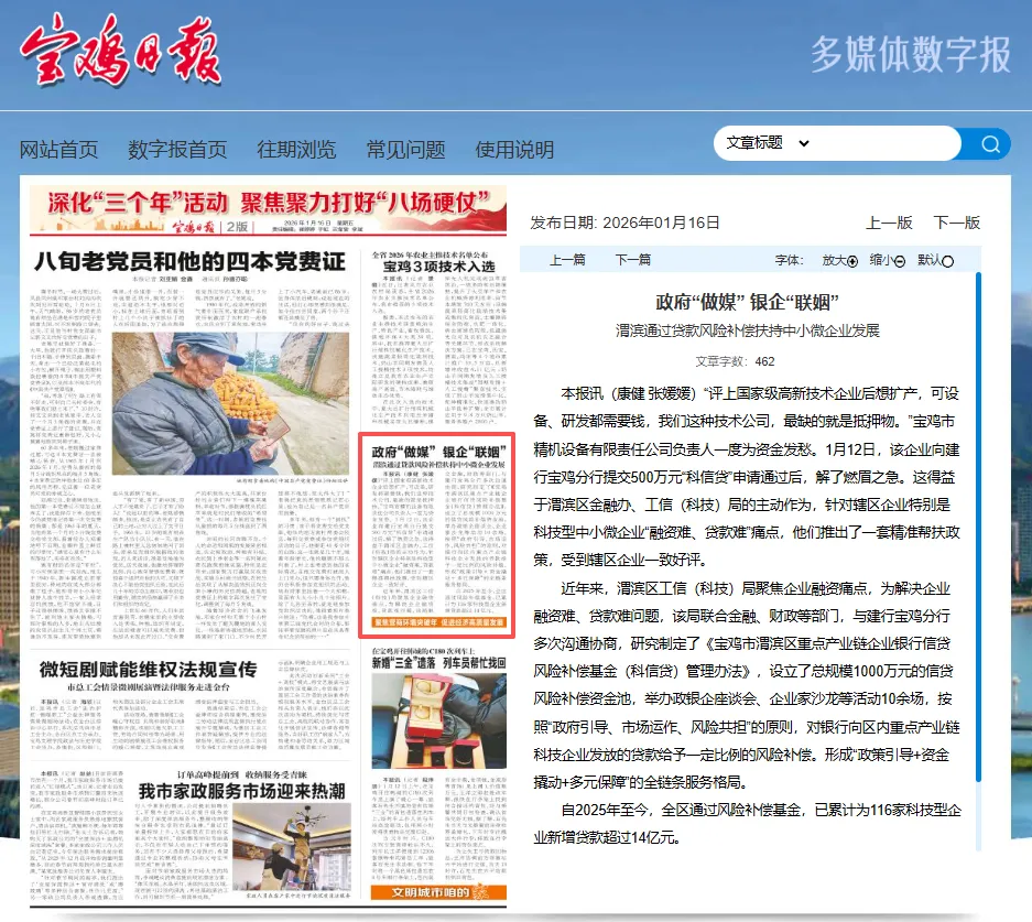 “评上国家级高新技术企业后想扩产,可设备、研发都需要钱,我们这种技术公司,最缺的就是抵押物。”宝鸡市精机设备有限责任公司负责人一度为资金发愁。1月12日,该企业向建行宝鸡分行提交500万元“科信贷”申请通过后,解了燃眉之急。这得益于渭滨区金融办、工信(科技)局的主动作为,针对辖区企业特别是科技型中小微企业“融资难、贷款难”痛点,他们推出了一套精准帮扶政策,受到辖区企业一致好评。