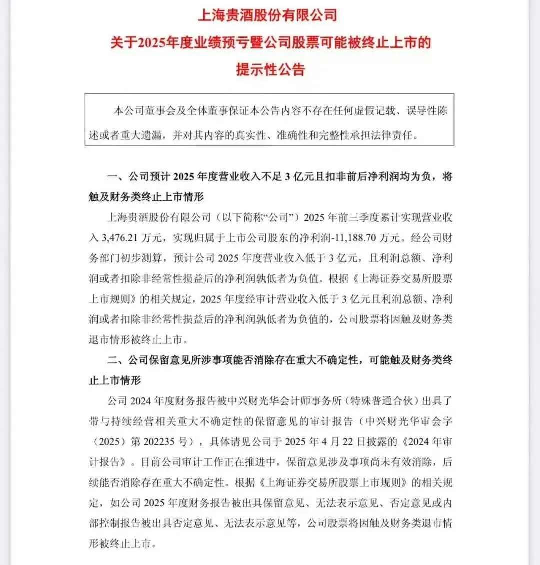 1月12日 *ST岩石(上海贵酒)业绩预告:预计2025年度营收低于3亿,且利润总额、净利润或扣非净利润至少有一项为负值。