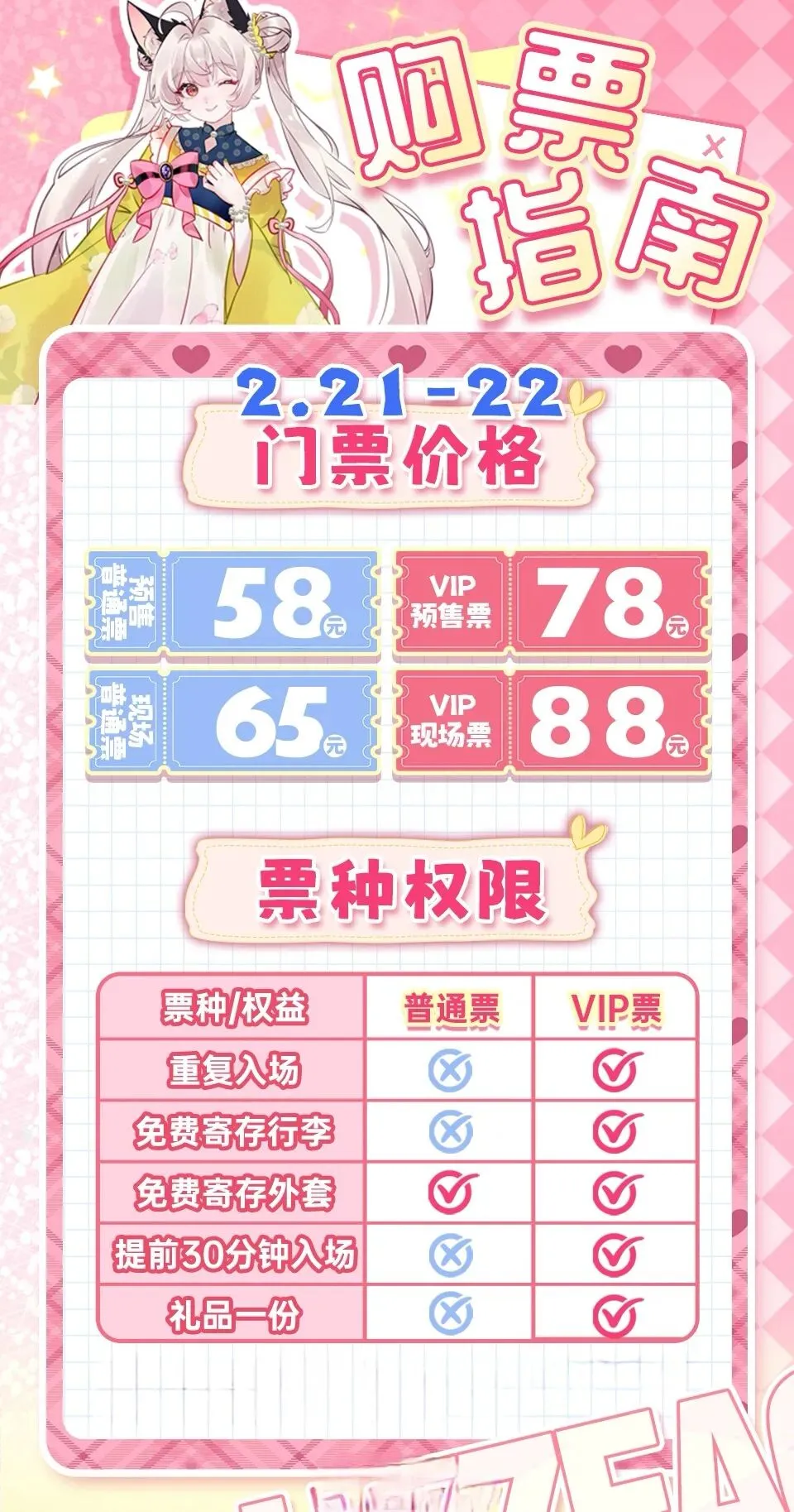 VIP票:9:00检票,多次出入,提前进场,礼品一份,免费寄存行李,免费寄存外套