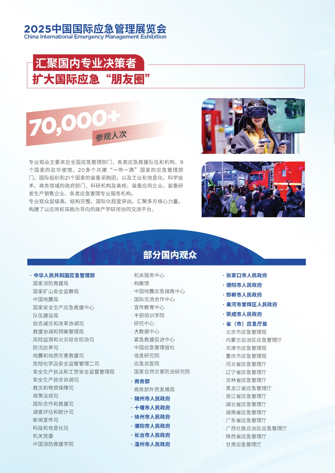 高水平办好2025中国国际应急管理展览会,是落实“一带一路”自然灾害防治和应急管理部长会议联合声明、推进应急管理装备创新发展的具体行动。展览会以“新质赋能、智慧应急”为主题,重点展示应急管理信息化、消防救援、防灾减灾救灾、安全生产及事故救援等领域的“高精特专”与“小快轻智”装备及其应用场景、综合解决方案。旨在通过展示应急管理领域最新技术装备成果,进一步搭建供需对接渠道,塑造良好的安全应急产业发展生态,为合力推动应急管理向智能化、无人化、自动化转型营造良好氛围,助推安全应急产业高质量发展。展览会由应急管理部国际交流合作中心主办,展期3天,300余家国内外知名企业参展,举办了10余场装备供需对接、技术研讨交流、产品发布路演等活动。