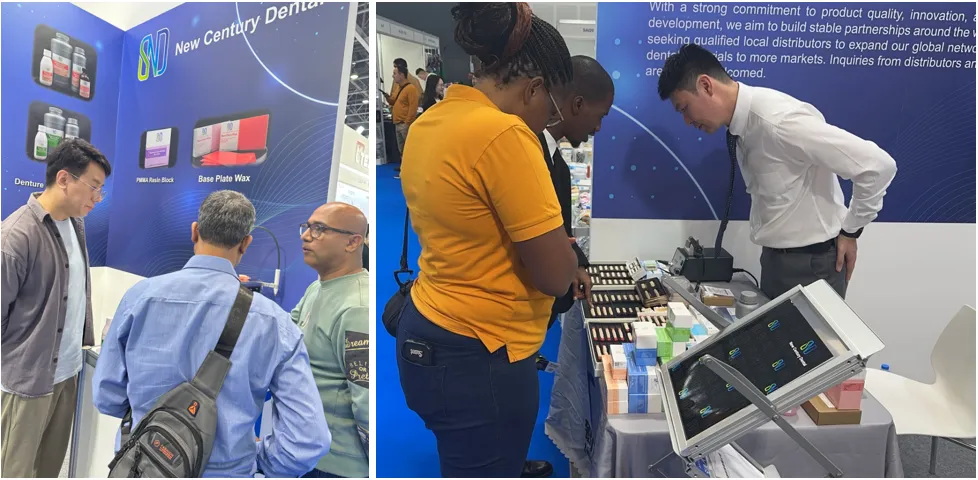 展会现场,新世纪齿科展台,我们集中展示了在口腔材料与数字化解决方案领域的最新成果,涵盖口腔临床产品和精密修复材料,其展现的“标准化、智能化、国际化”产品理念,吸引了众多国际经销商、临床专家及学者的驻足交流与深入探讨。