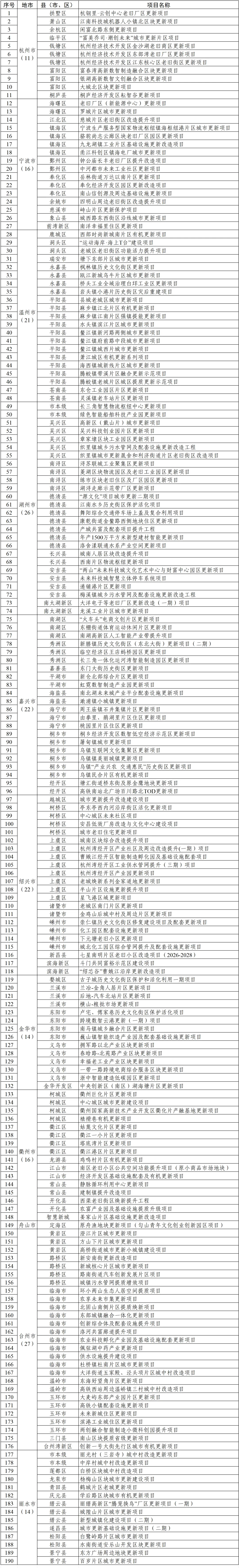 会上,发布了第三批城市更新金融服务重点项目190个,预计总投资额3544.81亿元。开发银行浙江分行、农业发展银行浙江省分行、农业银行浙江省分行、省建设集团和省交通集团等投融资机构作交流发言。余杭区、海曙区、永嘉县、南浔区、秀洲区、诸暨市、义乌市、龙游县、舟山群岛新区、临海市和青田县等县(市、区)重点推介了涵盖片区综合更新、厂区(园区)更新、住区更新、基础设施更新改造、历史街区活化利用等多种类型的城市更新项目21个。这些项目成熟度高、示范性强、前景良好,是提升城市品质、增进民生福祉的重要载体,也是培育发展新动能、激发消费新活力的核心抓手。
