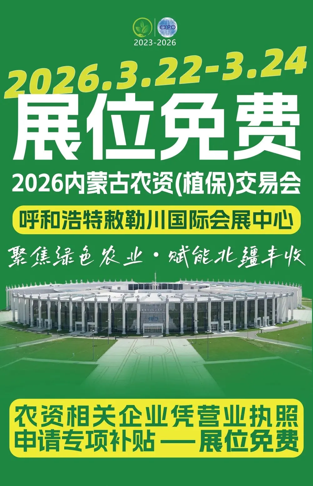 2026年内蒙古农资(植保)交易会将于 2026年3月22—24日在呼和浩特敕勒川国际会展中心盛大召开。本届展会继续享受“参展费用全补贴”政策,切实为企业减负,助力开拓北方农资市场。