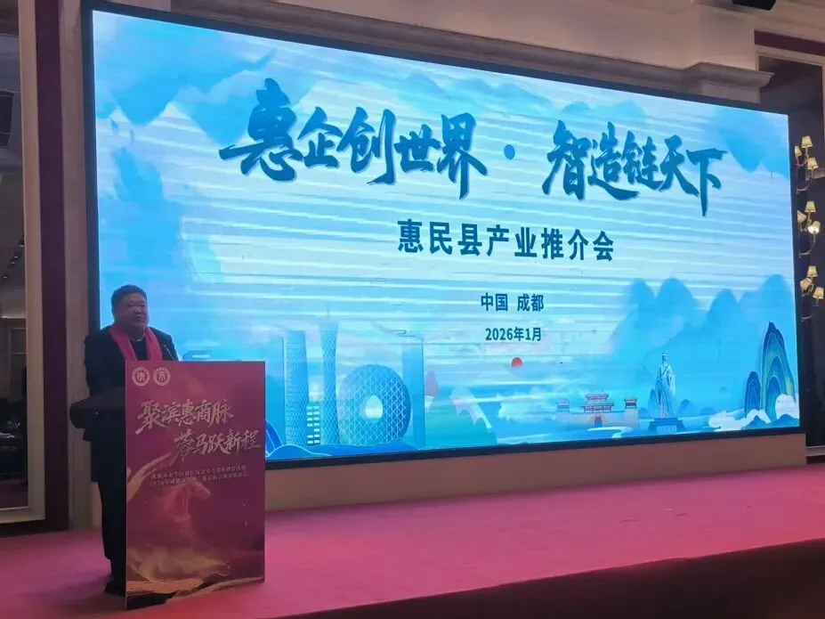 为进一步宣传推介惠民县优势产业,深化与成渝地区企业家的对接交流与务实合作。1月18日,惠民经济开发区党工委委员、管委会副主任刘新国率队赴四川省成都市,依托成都惠民商会平台资源,成功举办 “惠企创世界・智造链天下” 产业推介会。本次活动吸引了在川发展的惠民籍企业家、成都本地企业代表、行业商会负责人及各界嘉宾200余人齐聚一堂,共话发展机遇,共绘合作蓝图。