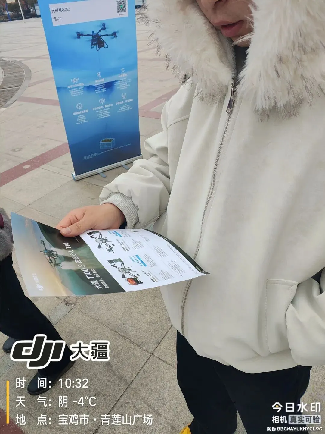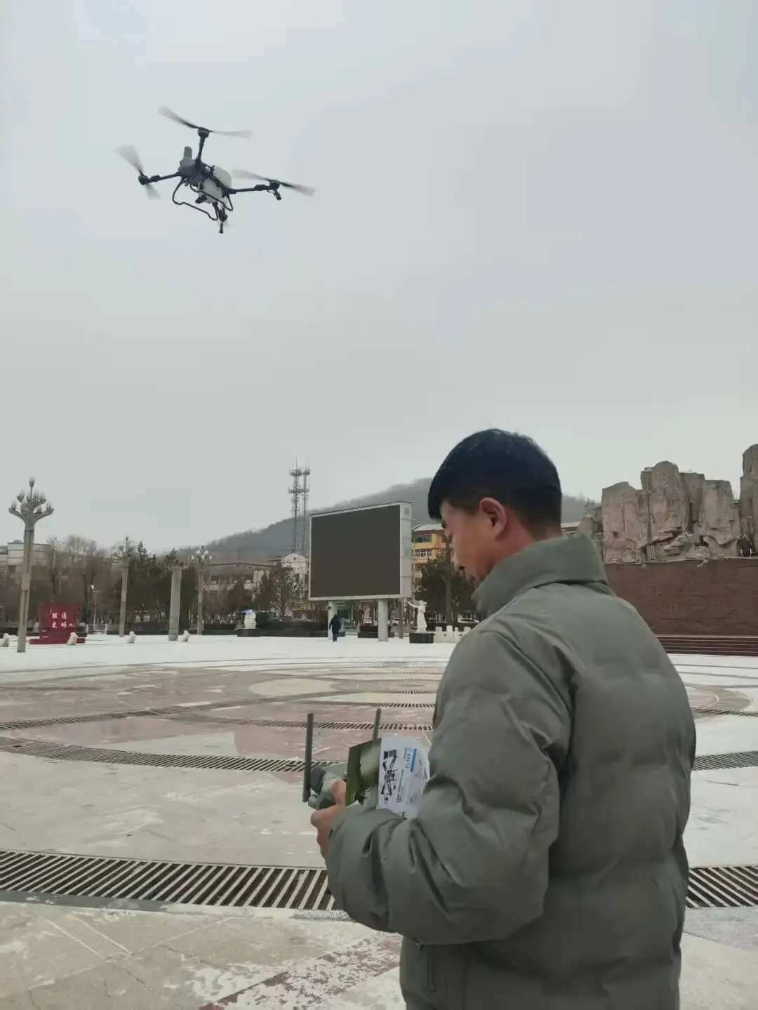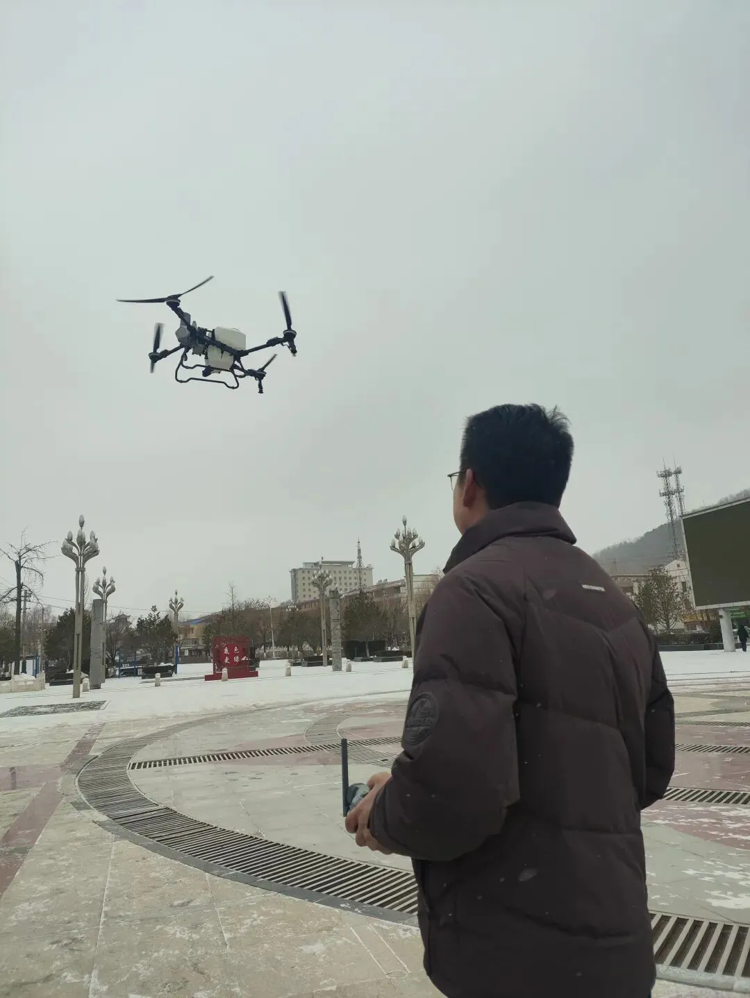 在大家的注视下,大疆农业无人机腾空而起。它在风雪中完成悬停、转向等一系列飞行动作,稳定的性能赢得了阵阵赞叹。