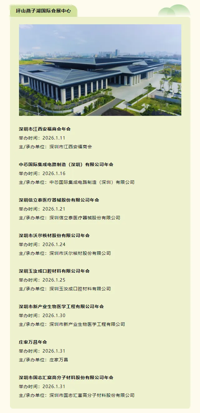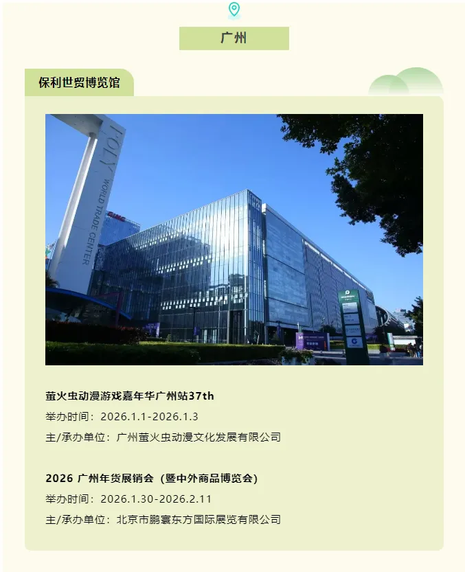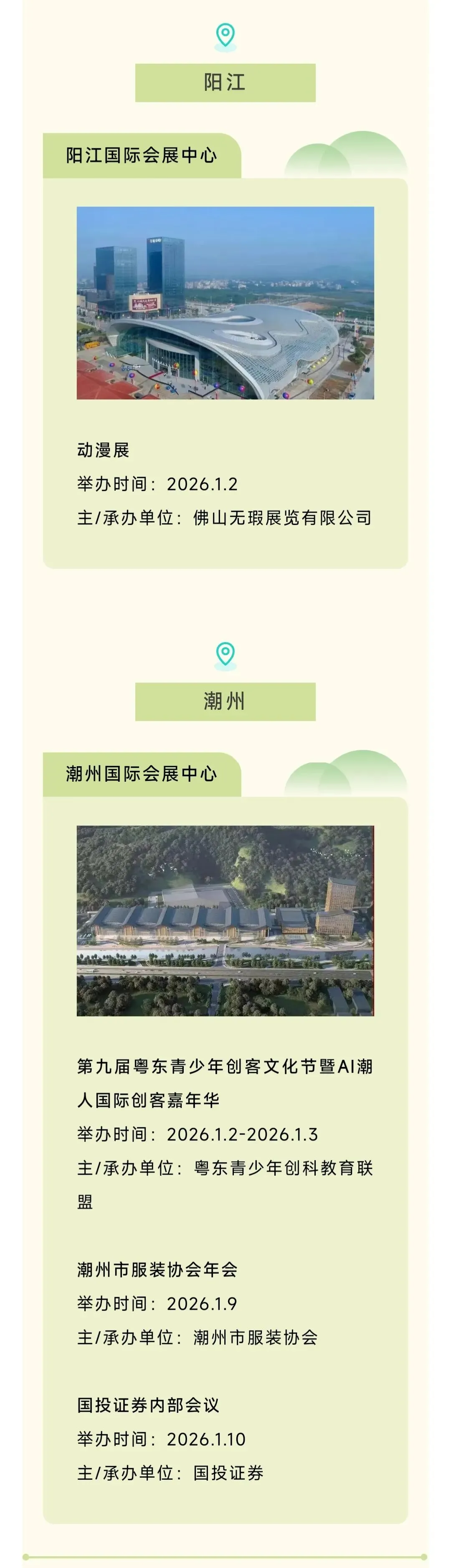 *以上信息均来自展馆/官方等网络整理,展览信息排期仅是预告,仅供参考,展会主承办机构随时可能调整,不构成要约,前往参观参展请自行联系主办方核实开展情况,展会是否如期举办,存在一定的不确定性,最终以展会实际举办为准,请参观参展前务必核实确认后前往,以免耽误您的行程。欢迎大家关注本公众号,了解更多会展资讯。
