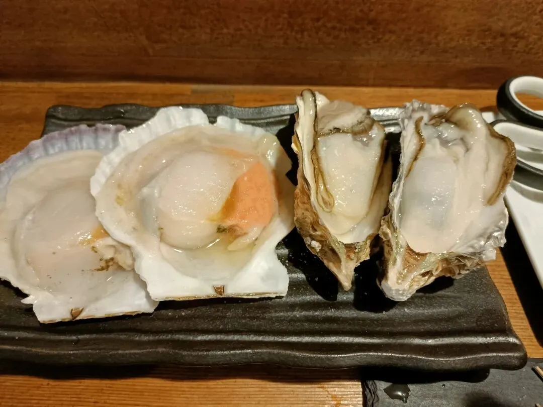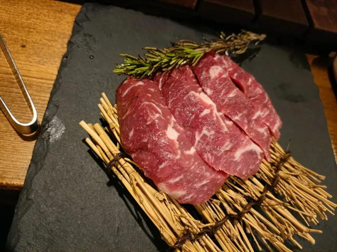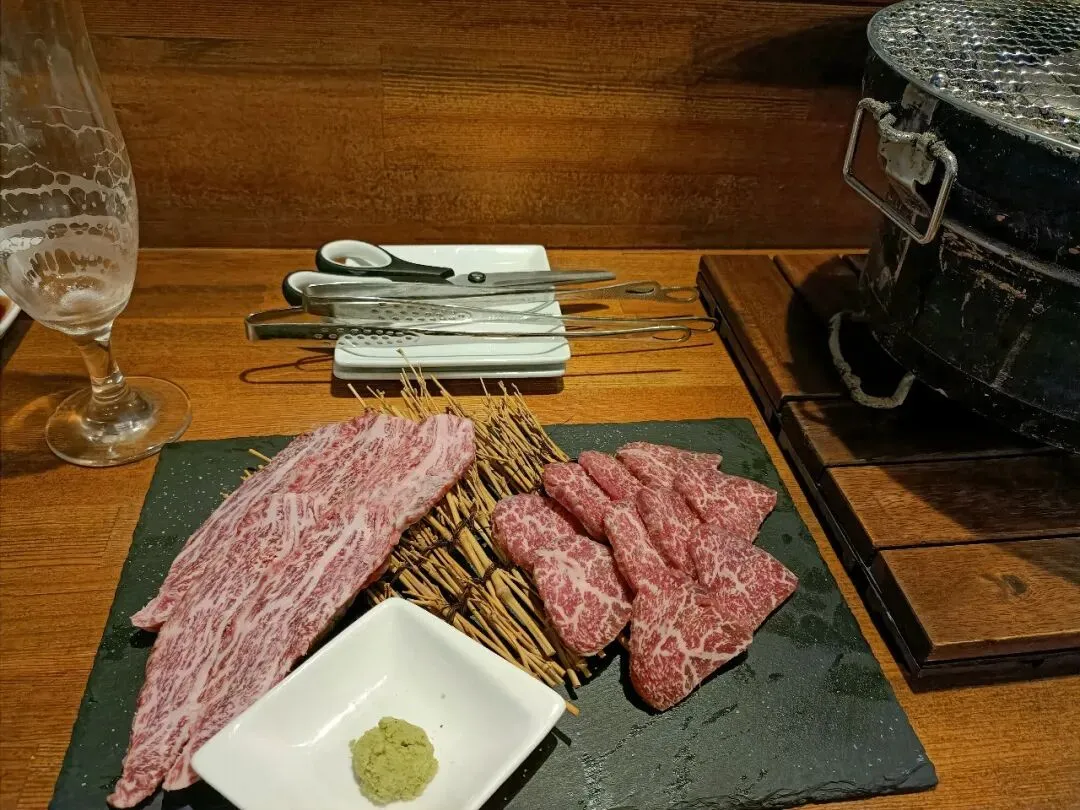 推门而入,居然座无虚席,看来大家都是没得选最后走到了一起。桌子已经没有空位,只有吧台还有几张空位,虽然我不太喜欢坐吧台吃饭,但为了尽快填饱肚子,也是别无选择。先来一杯啤酒压压惊,一口冰凉的啤酒下肚,才精神舒爽的开始看菜单,除了照片能看出各种牛肉之外,其他一个字也不懂,一种在微笑国的感觉又浮现出来,没文化真可怕,连饭都吃不到。不过我有走南闯北的大杀技,看周围人点什么就就跟着点就好了,绝对不会错。不一会小炭火炉和各种和牛就一样一样的摆到眼前,雪花牛烤出来口感是绝对和我们牛仔州粗旷的T-Bone完全不一样。口感细腻,润滑。看着粉嫩的牛肉在火上颜色渐渐变深,白色的雪花逐渐融化浸入肉丝也是一种视觉享受。更赞的是大个的生蚝和扇贝是保持我今晚体力的关键,就把它们当红牛吃了吧。终于酒足饭饱,慢慢踱出餐馆来到空空的连车都没有几辆的街上,向酒店方向走去。