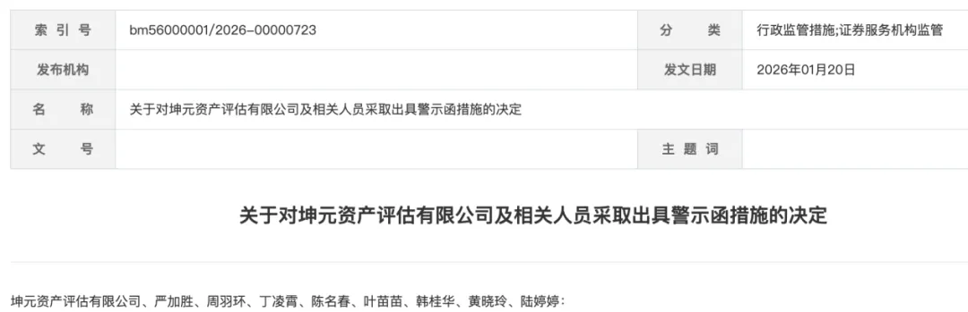 1月20日,浙江证监局对坤元资产评估有限公司(简称“坤元资产评估”)下发警示函,指出公司及8名员工存在内部治理、质量控制体系、独立性管理、项目执业质量等四个方面违规问题。