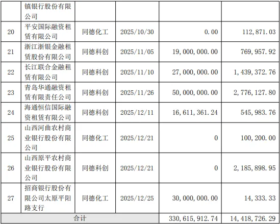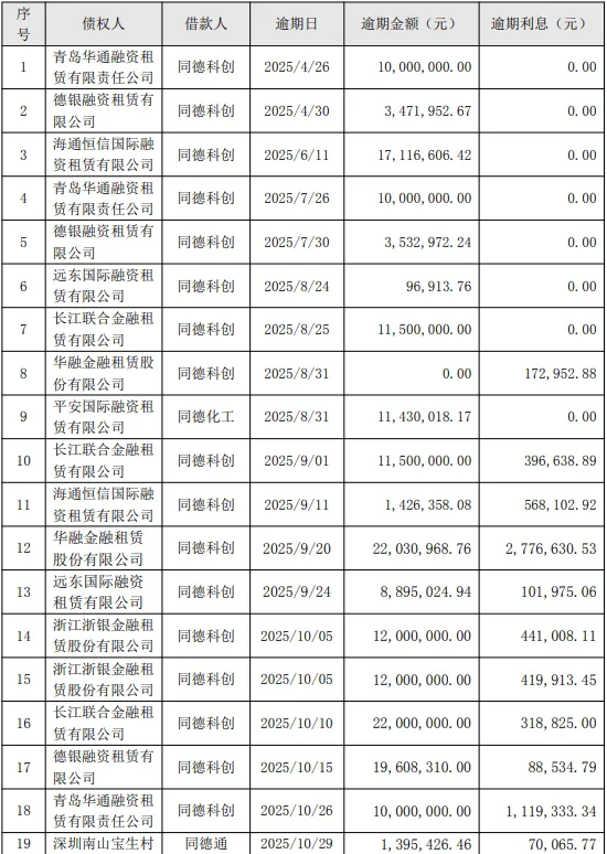 2025年底,公司发布关于公司及全资子公司部分债务逾期的进展公告披露:截至2025年12月25日,公司和子公司同德科创等在融资租赁公司等金融机构的逾期本息合计约为3.45亿元,详情如下: