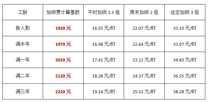 2、加班费计算基数:底薪1900元+全勤20元+工龄奖(满半年50元/月,满一年100元/月,满二年200元/月,满三年300元/月;(满勤时加班费计算如下:)