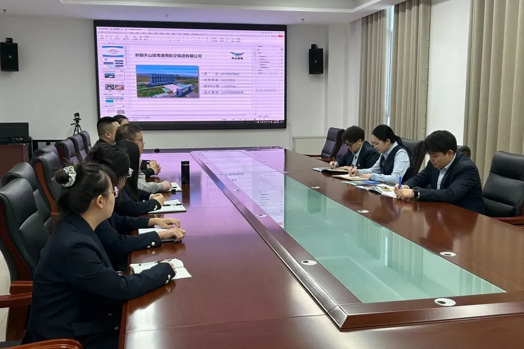 在新疆天山雄鹰通用航空集团会议室里,担保公司工作人员正与企业负责人开展回访。