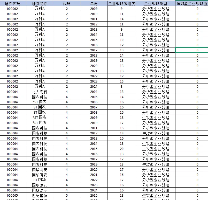 证券代码 证券简称 代码 年份 企业战略激进度 企业战略类型 防御型企业战略虚拟变量 分析型企业战略虚拟变量 进攻型企业战略虚拟变量 行业代码 行业名称 所属省份 所属省份代码 所属城市 所属城市代码