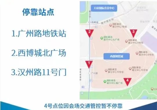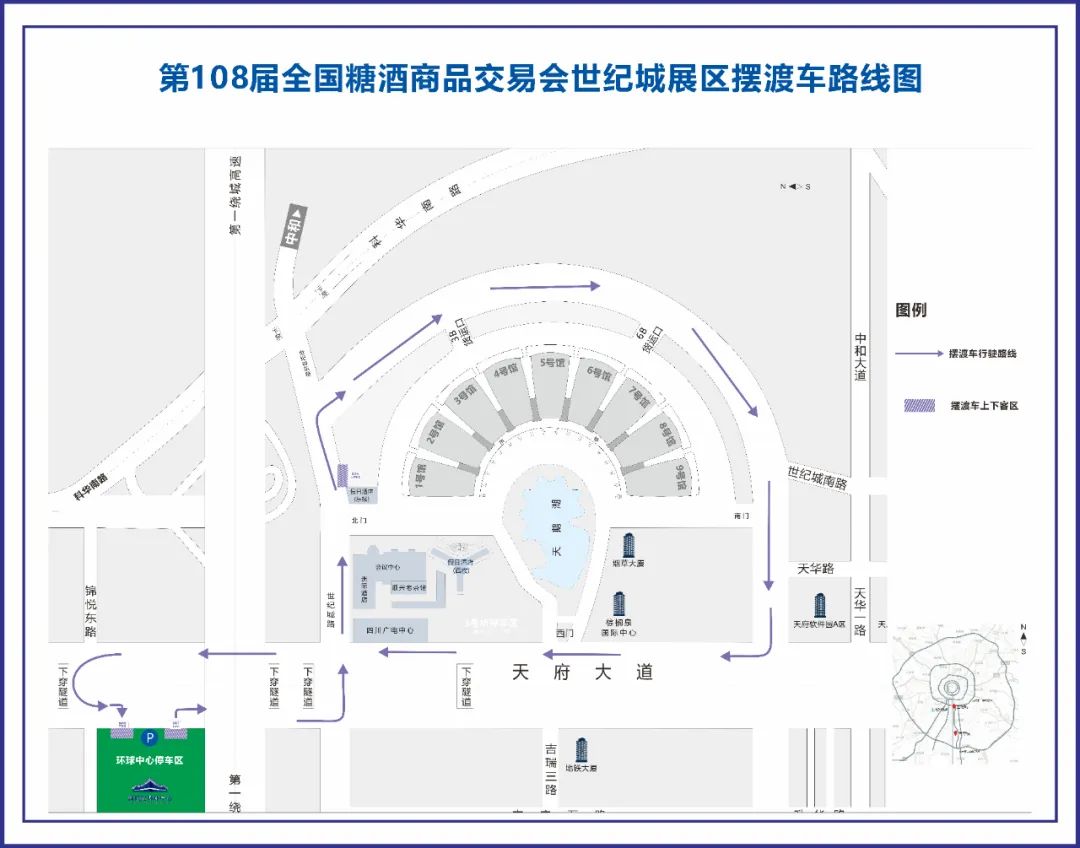 同时,为缓解糖酒会期间停车位紧张问题,方便市民及展商往返于展会现场,减少步行路程,免费摆渡线于4月10至14日开通,起讫点:环球中心—世纪城,收出车时间:7:00-19:00,每3-5分钟一班,往返于环球中心和世纪城之间。