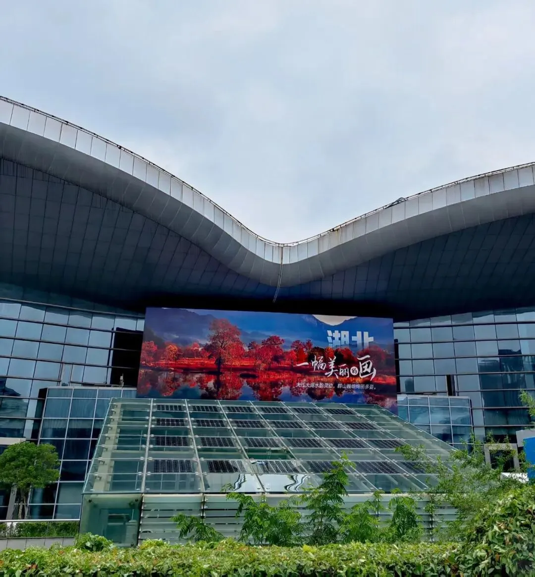 武汉国际博览中心展馆前,巨幅画作展露湖北这片位于中国中部的神奇土地。