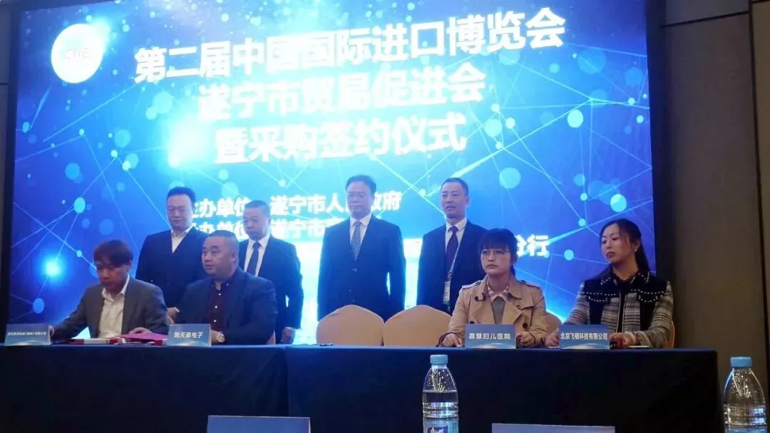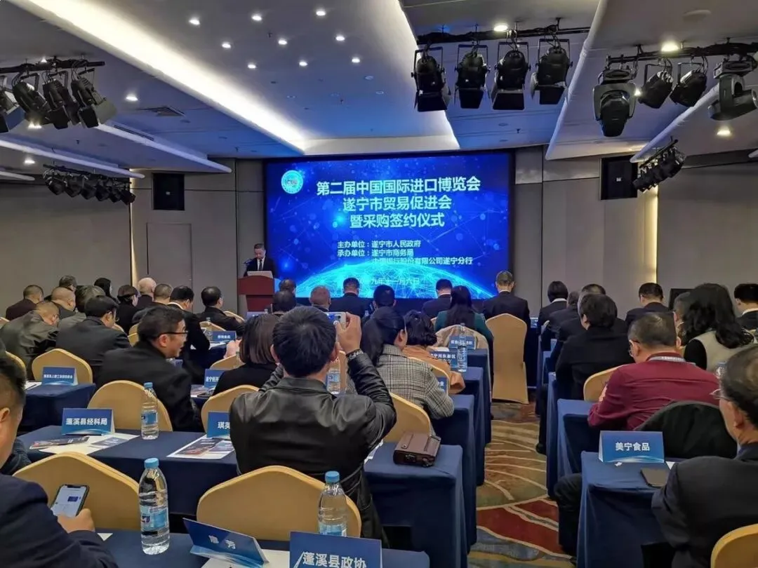 11月6日,第二届中国国际进口博览会遂宁市贸易促进会暨采购签约仪式在上海举行。副市长雷云、中国银行四川省分行副行长阳勇出席并致辞。