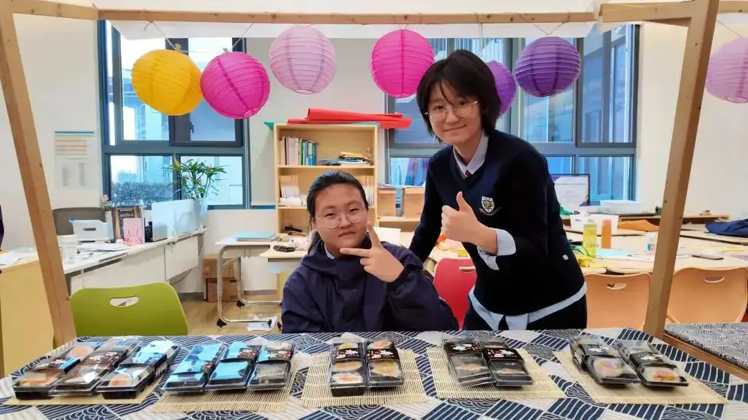 料理台旁整齐陈列着同学们提前精心制作的寿司,每一份都凝聚着对食材搭配的巧思,静静诉说着日式饮食的精致美学;