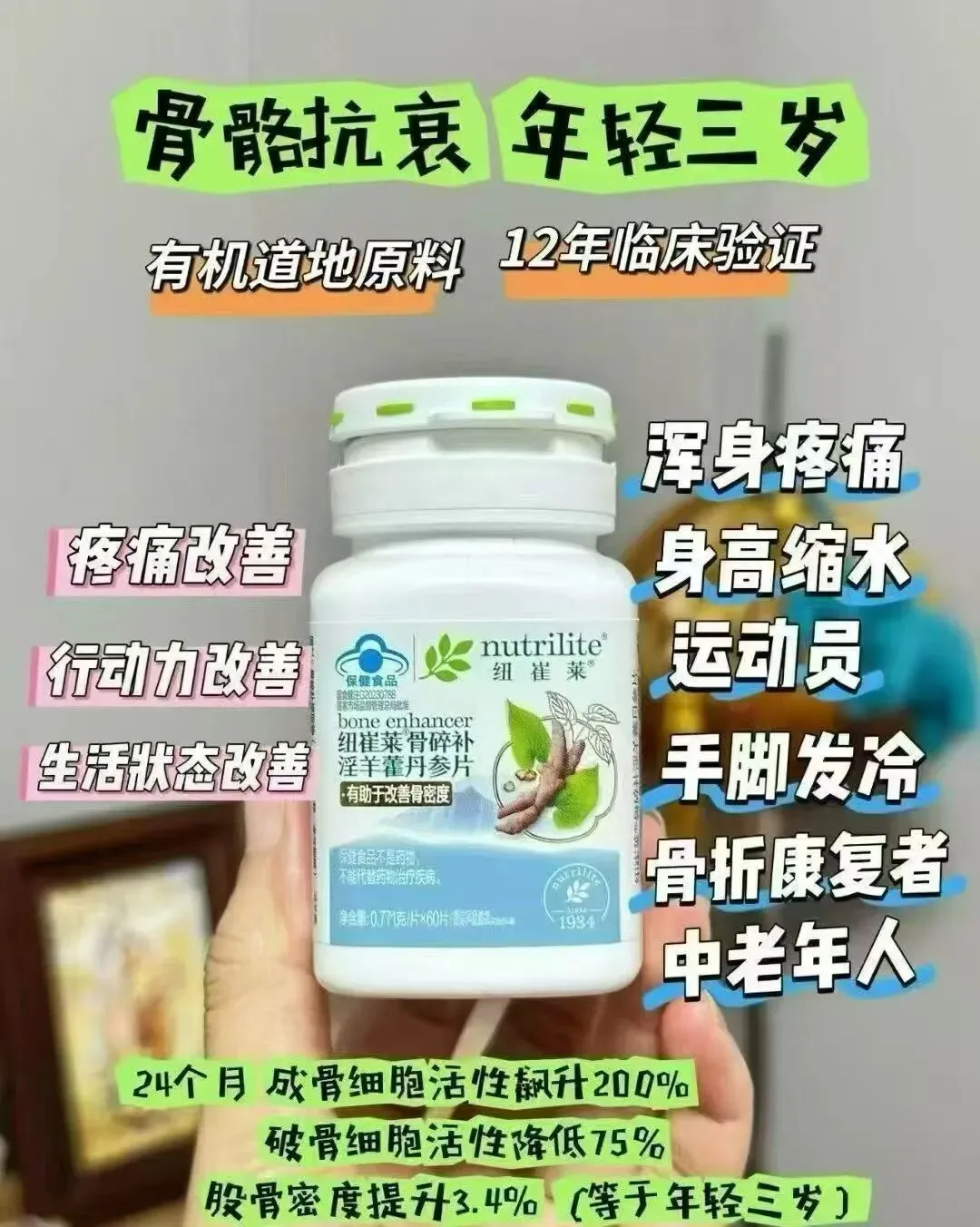 提升“生产线效率”的关键,是安利纽崔莱®骨碎补淫羊藿丹参片(俗称“金骨丹”)——国家认证的“蓝帽子”保健食品,专为骨骼代谢失衡设计。