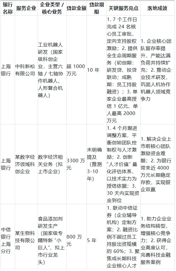 在服务对象上,银行优先选择国家级科创企业、专精特新 “小巨人” 及拟上市企业,聚焦工业机器人、芯片、医疗器械、数字经济等硬核科技领域,这些企业普遍存在 “核心人才依赖度高、股权激励需求迫切但员工资金不足” 的痛点。服务模式上,银行通过 “公私联动”(对公部门评估企业技术与前景、个贷部门审核员工资质)、“全生命周期配套”(从初创期研发贷到成熟期持股融资)及 “风险管控创新”(如上海银行 “人才价值评估”、中信银行联动券商),既解决资金问题,又保障风险可控。