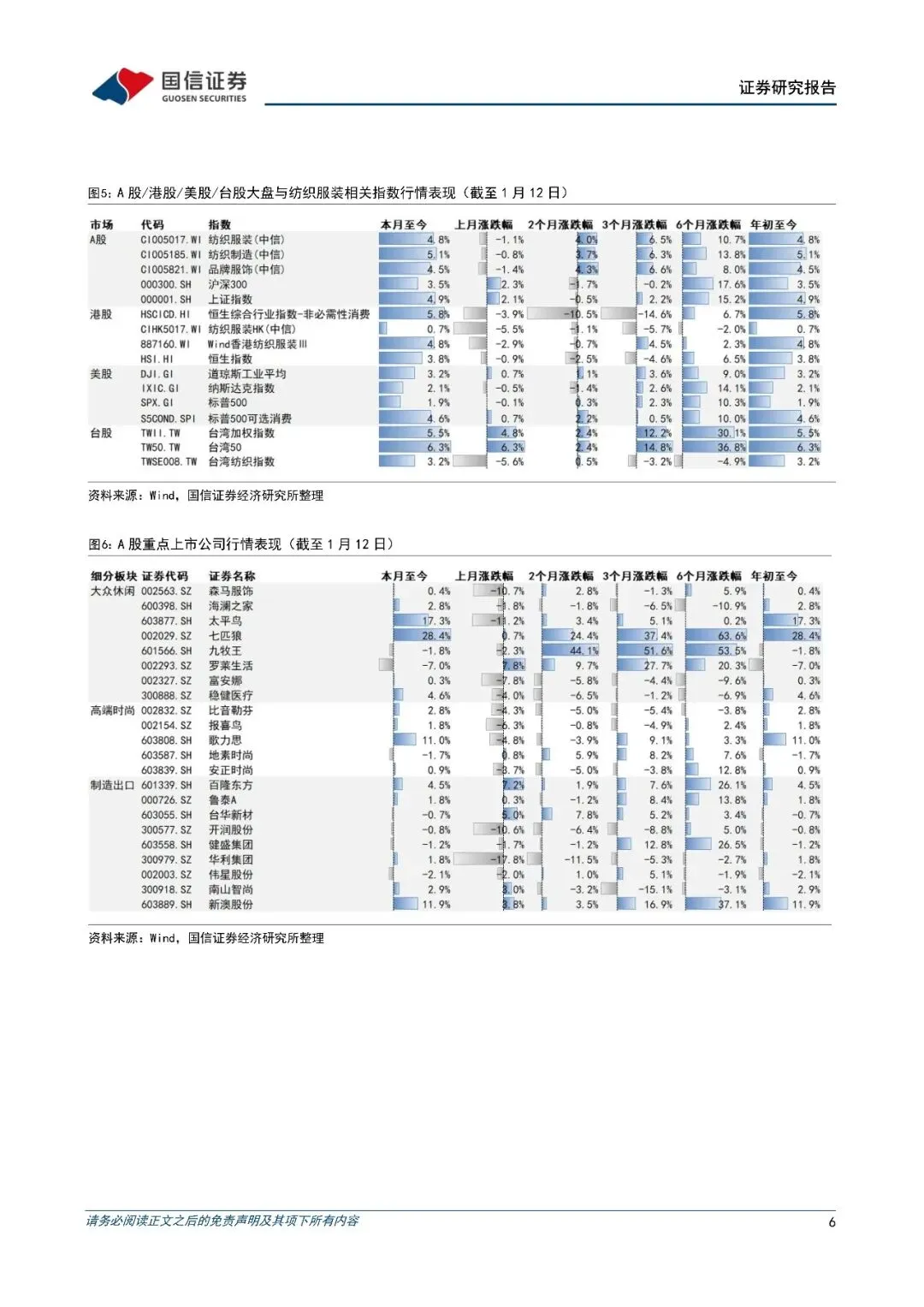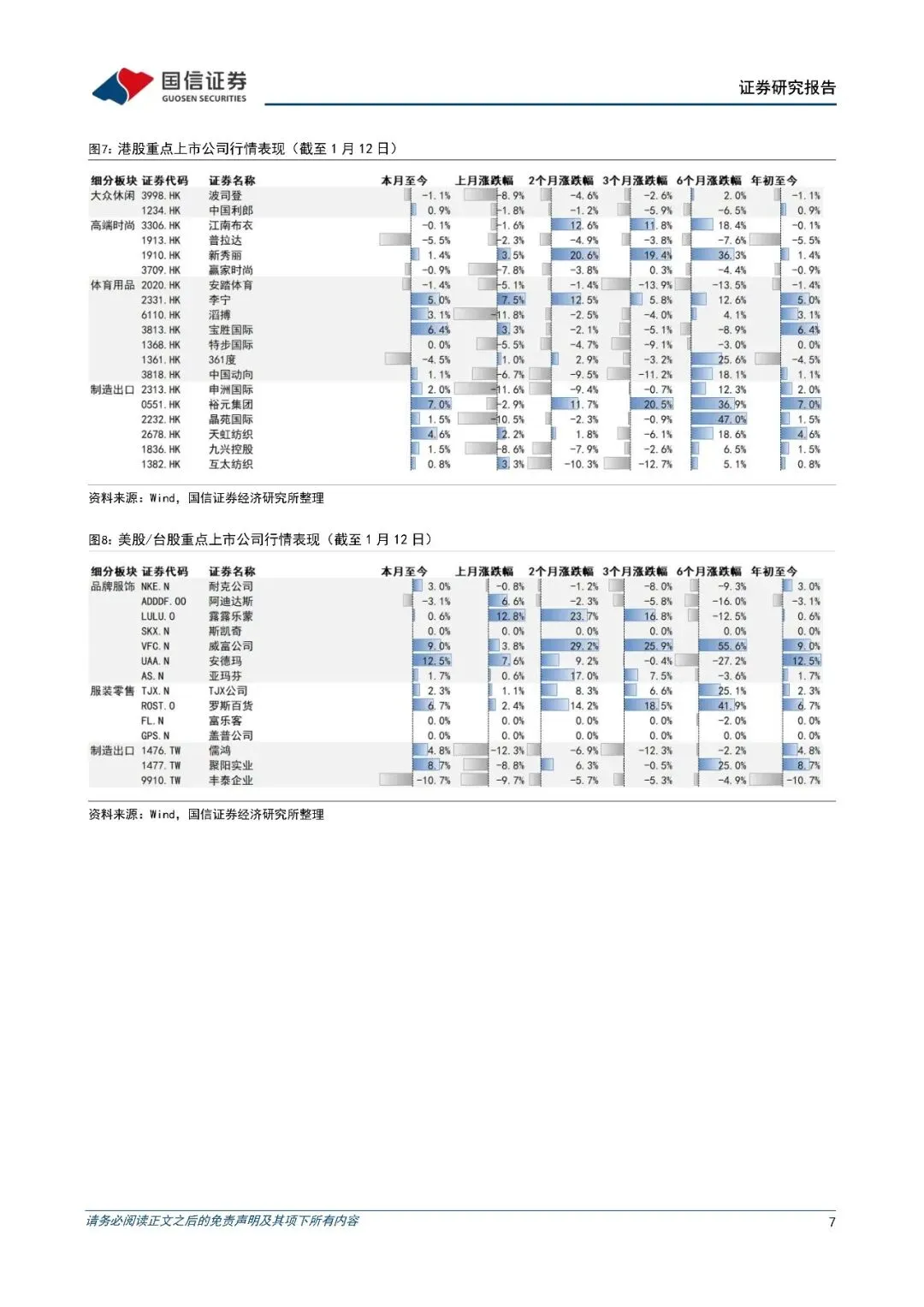 12 月 A 股纺服板块走势弱于大盘,其中纺织制造表现优于品牌服饰。1 月以来板块走势强于大盘,纺织制造表现优于品牌服饰,1 月以来分别+5.1%/+4.5%;港股纺服指数 12 月下降 5.5%弱于大盘,1 月以来由跌转涨。重点关注公司中1月以来涨幅领先的包括:安德玛(12.5%)/新澳股份(11.9%)/歌力思(11.0%)/威富公司(9.0%)/百隆东方(8.5%)/裕元集团(7.0%)/宝胜国际(5.3%)/李宁(5.0%)/稳健医疗(5.0%)/天虹纺织(3.3%)/海澜之家(2.8%)。