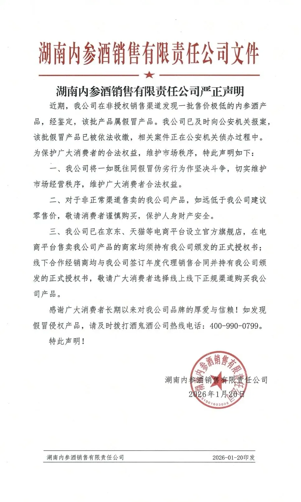 2026年1月21日,湖南内参酒销售有限责任公司发布《严正声明》,直指近期在非授权渠道发现一批低价假冒内参酒,目前已报案并完成涉案产品收缴。