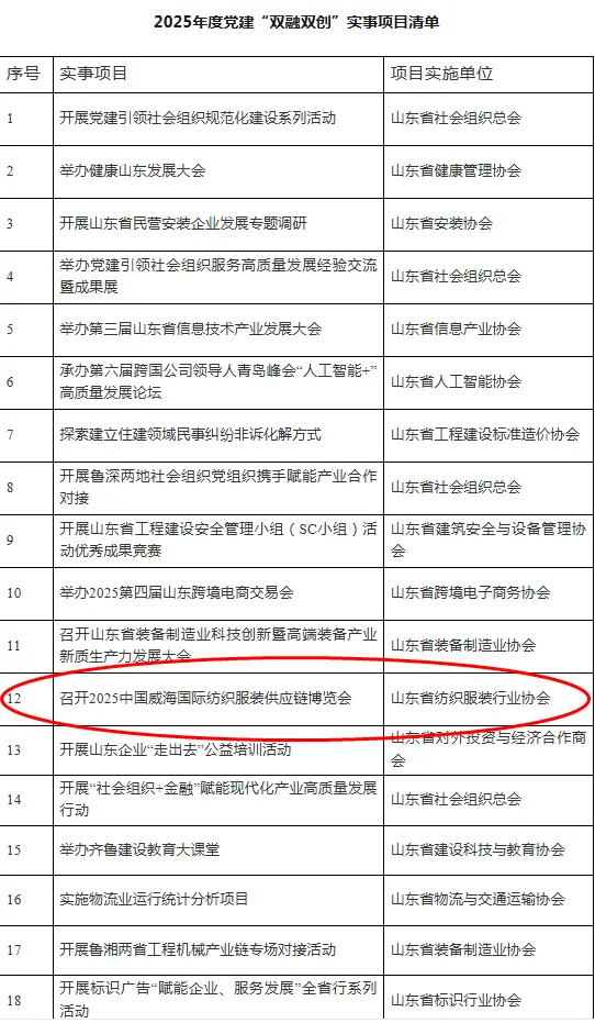 近日,中共山东省社会组织综合委员会对2025年度所属社会组织党建“双融双创”实事项目予以通报表扬,由山东省纺织服装行业协会主办、青岛西默会展承办的“中国·威海国际纺织服装供应链博览会(简称CWTE威海纺织展)”项目成功入选。