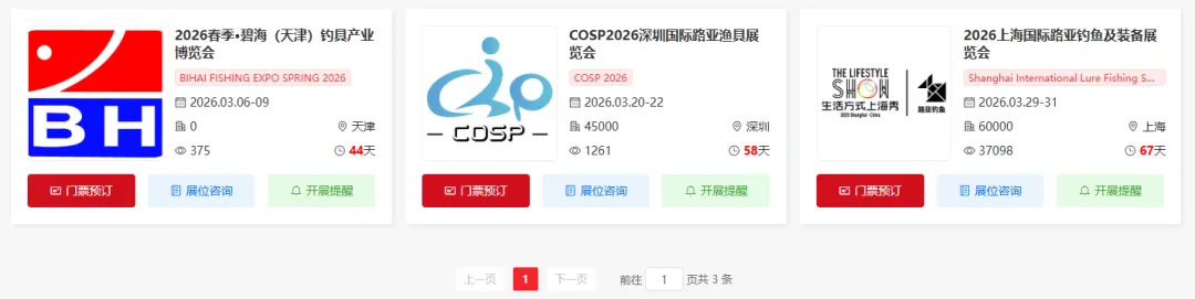 2026年全国钓具展会将会在哪些城市举办?小编为您提供2026年全国钓具展会时间、展馆地址以及入场门票。接下来让我们一起来了解下全国钓具展会2026年时间表!末文获取2026钓具展会门票预约入口~(大多门票限时免费)