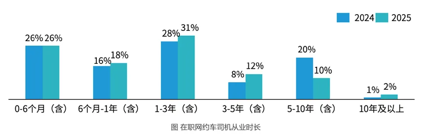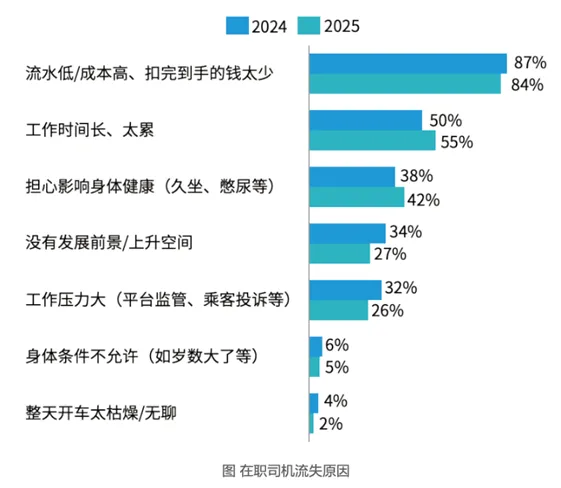 司机端面临的核心问题仍未缓解:单价低、平台抽成比例高、付出与收入严重不匹配。虽然在2025年司机日均单量较去年有所上升,但收入并未同步增长,同时,超长工作时间、平台规则不透明等问题叠加,导致职业满意度低。
