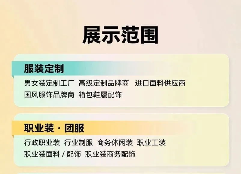 服装定制主题展以专业为定制发声!集结全国30+省份400+家男女装定制工厂、高级定制品牌商、进口面料供应商、国风服饰品牌、国产面辅料、箱包鞋履及配饰等全产业链企业,打造服装定制行业一站式高效对接商贸平台!