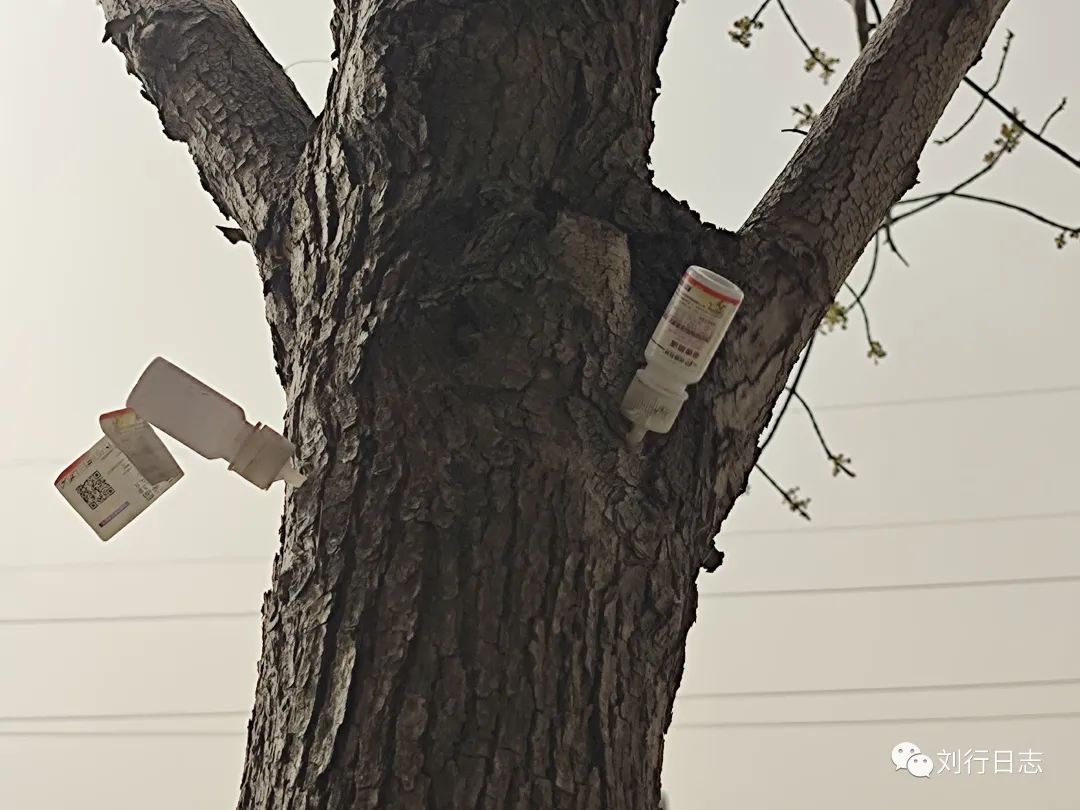 人生病要打针吃花,见过给树打点滴的,倒是头一次见到给树打药的,瞅了半天,没瞅清楚是什么药。