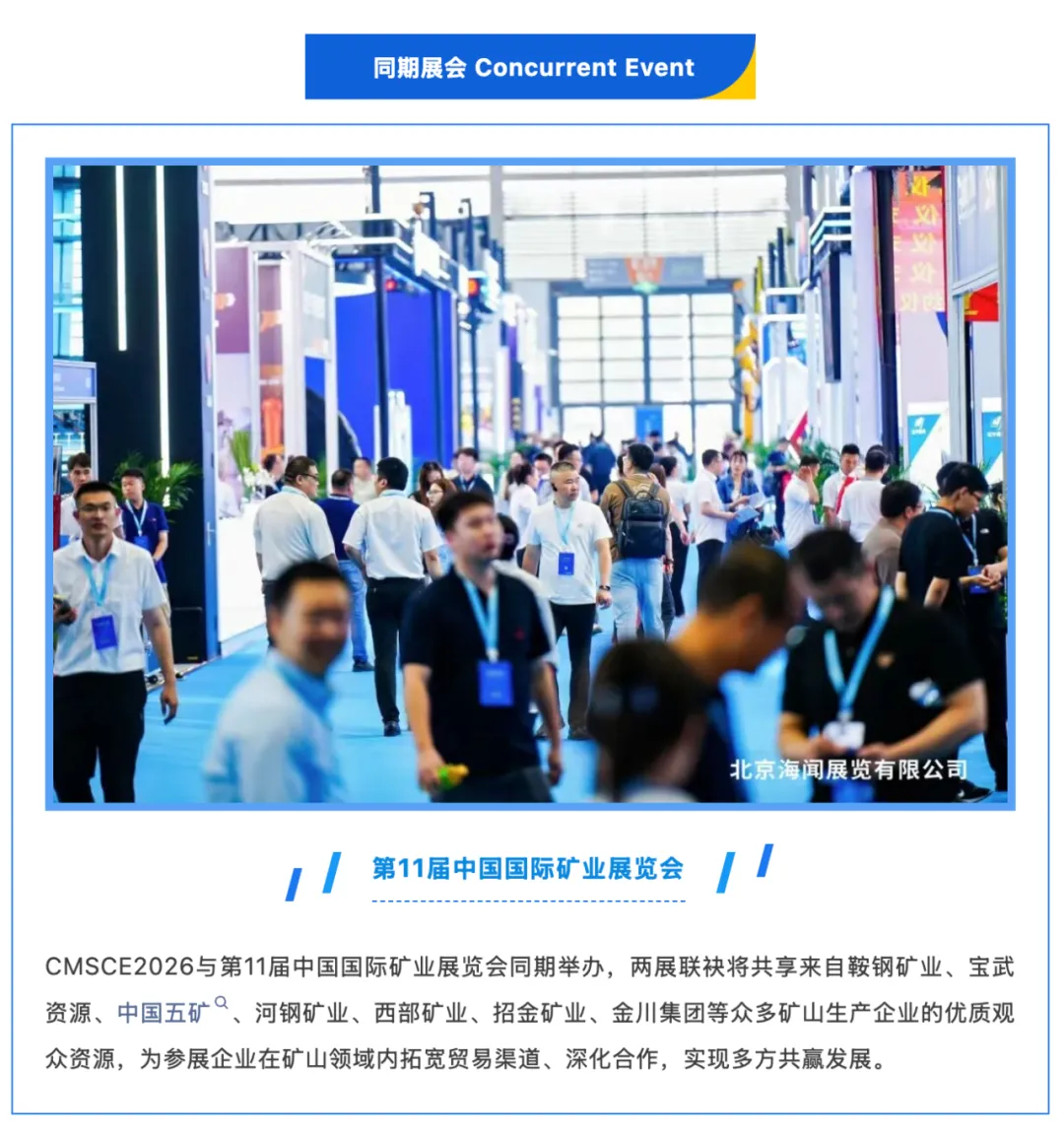 CMSCE2026以“链动世界 共创共享”为主题,于2026年6月10-12日在北京中国国际展览中心(顺义馆)举行。诚邀全球矿山行业同仁相聚北京,共探发展新路径,共享合作新机遇,共赢产业新未来!