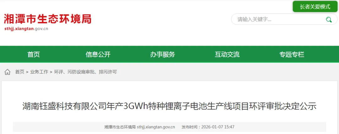 日前,湘潭市生态环境局发布了《湖南钰盛科技有限公司年产3GWh特种锂离子电池生产线项目环评审批决定公示》。