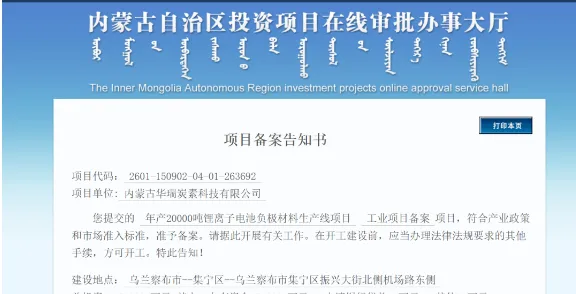 根据备案信息,该项目建设地点位于乌兰察布市集宁区振兴大街北侧机场路东侧,总投资额达 51000 万元,且全部为企业自有资金,充分彰显了企业对项目发展的坚定信心与雄厚实力。项目计划建设起止年限为 2016 年 11 月至 2026 年 12 月,建设周期内将逐步完善各类设施与生产线布局。在建设规模及内容方面,项目将打造集办公、生产、配套于一体的现代化产业基地,规划建设办公楼、食堂、石墨化主车间、坩埚车间、炭化车间、吸料车间、辅料车间、新坩埚车间、开闭站等一系列主体及配套设施,同时配置核心生产设备,包括 32 台石墨化炉、2 条碳化隧道窑、2 条磨粉线以及其他公辅和配套设施,最终实现年产 20000 吨锂离子电池负极材料的产能目标。