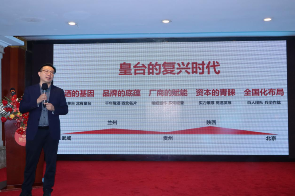 甘肃皇台酒业股份有限公司总经理代继陈在致辞中表示,皇台酒业作为甘肃的知名企业,承袭武威4000年酒文化底蕴,和大唐开国皇帝李渊所赐的皇家文化基因,皇台酒自诞生起,便具有了与生俱来的高贵禀赋。并从皇台酒业六大优势(上市公司、国资助力、实力加持、大师背书、核心产区、金字招牌),以及夯实基础,深耕市场,稳步布局全国市场坚实基础方面入手,和与会嘉宾一起展望了皇台酒业心无止境,聚势共赢,共同谱写皇台奋发有为的宏伟篇章。