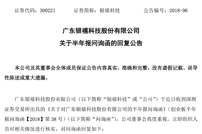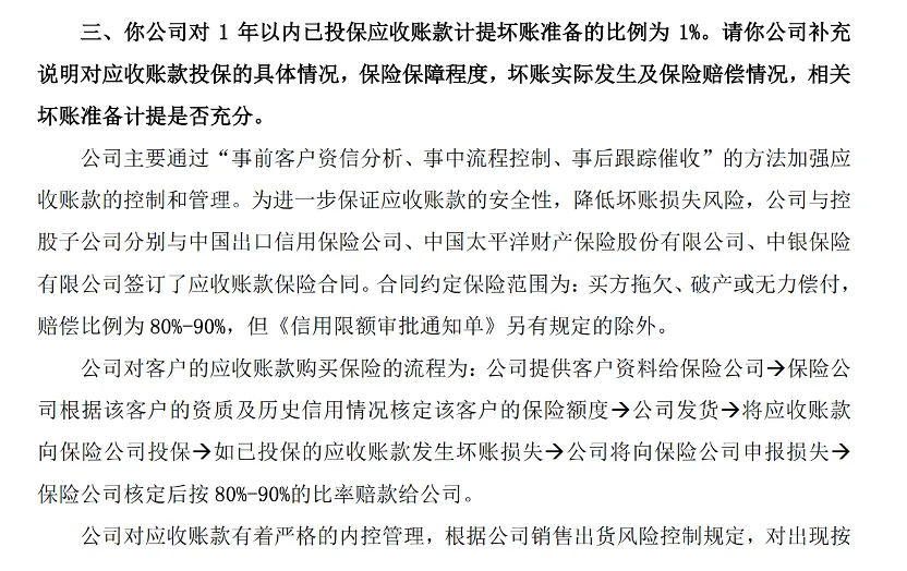 交易所对银禧科技“1年以内应收账款计提坏账比例1%”提出了询问,要求公司做出对应收账款投保情况的具体说明。银禧科技在公告中回复如下: