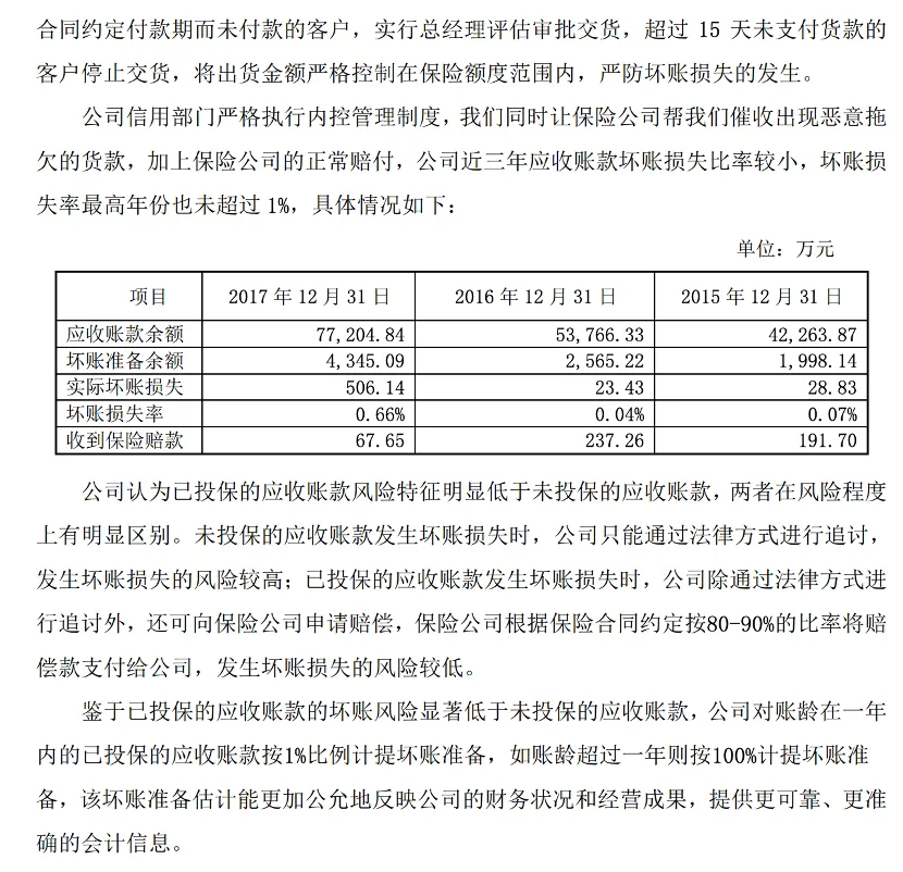 如果已投保的应收账款发生了逾期风险,公司可向保险公司提交报损材料,核定无误后保险就会启动理赔进行损失补偿,按照约定的比例对公司的应收账款损失进行兜底。从2015年-2018年,银禧科技收到的保险赔款分别为191.7万、237.26万、67.65万元、84.71万元,切实发挥了保险的兜底补偿作用。