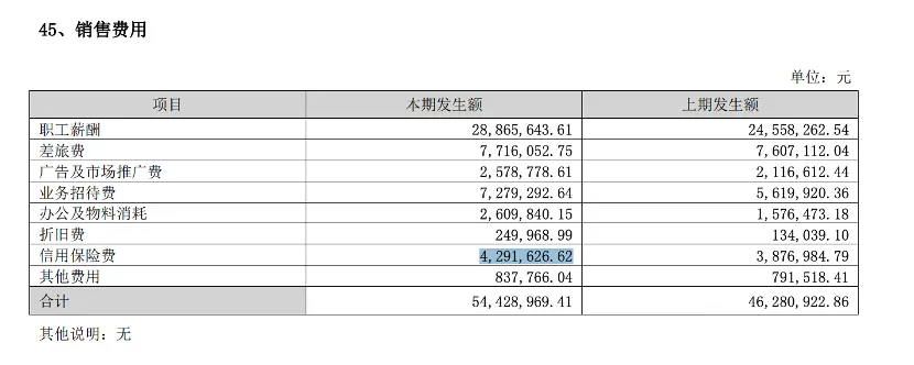 2018年或许我们认为已经时隔久远,但是从银禧科技2024年的年度报告中可以看到,这家公司这么多年来一直在坚持投保贸易信用险,并在其财报的“销售费用”中进行单独列示。