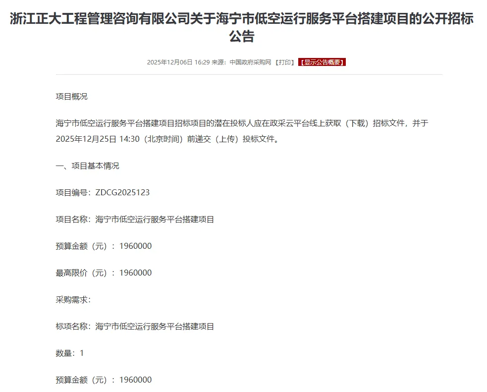 海宁获评浙江低空经济“先飞区”后,首个重磅项目——196万低空运行服务平台招标启动!本文独家拆解招标文件,详解其如何整合起降场、无人机、气象站等数据,打造集政务飞行、商用服务、安全监管于一体的“空中大脑”,为全国低空经济发展提供范本。