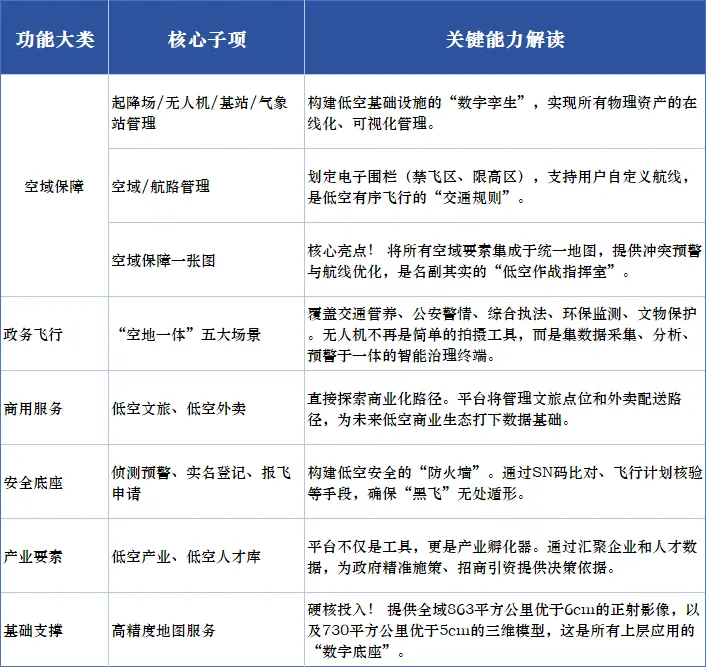 这份招标文件远不止是一个采购清单,它几乎是一份完整的低空经济城市应用蓝图。平台将通过PC网页端呈现七大核心功能模块,我们将其核心内容梳理如下: