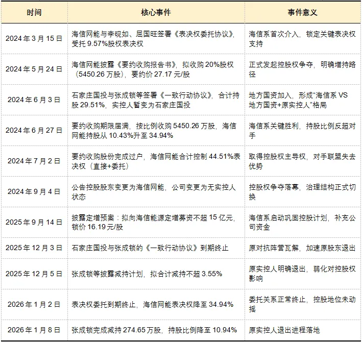 本次股权变动历经“控股权争夺-海信系入主-巩固控股-原股东退出”四阶段,核心时间线如下: