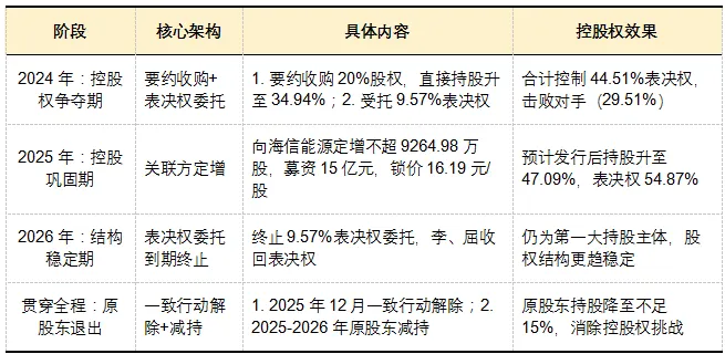 公司股权变动核心逻辑为“控股权争夺与巩固”:2024年前由创始人张成锁及其一致行动人实际控制;2024年青岛海信网络能源股份有限公司(简称“海信网能”)通过“要约收购+表决权委托”介入,与石家庄国有资本投资运营集团(简称“石家庄国投”)展开控股权争夺;2024年9月海信网能成为控股股东,因间接控股股东海信集团控股无实控人,科林电气变更为无实控人状态。2025年海信系通过定增进一步巩固持股,2026年表决权委托到期未动摇控股地位,原实控人张成锁通过减持逐步退出。