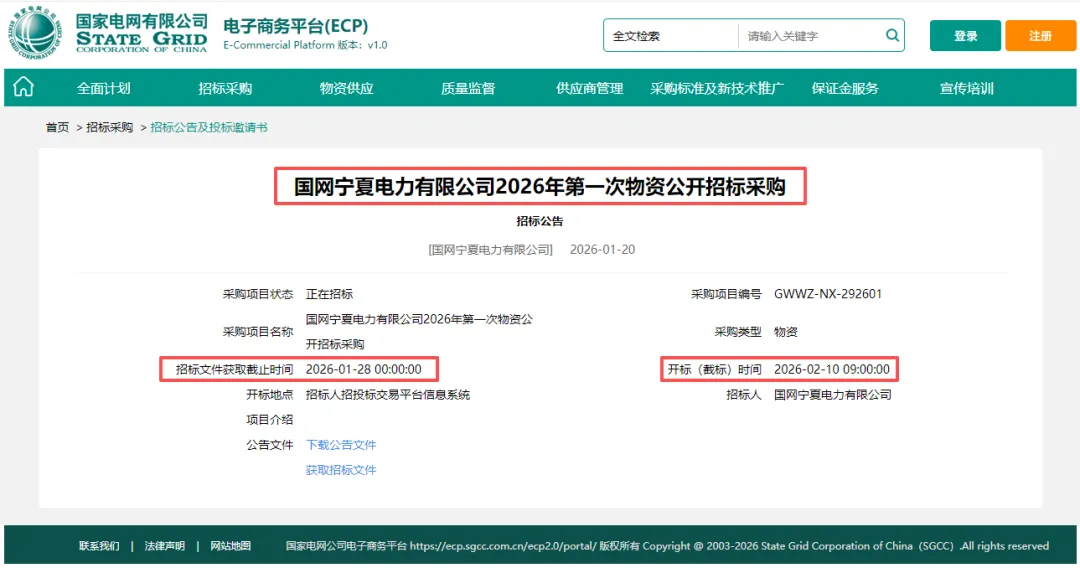 招标文件(电子文件)免费获取。凡有意参加投标者,请于2026年1月20日--2026年1月28日00:00(北京时间,下同),登录招标人招投标交易平台信息系统(国家电网有限公司电子商务平台þhttps://ecp.sgcc.com.cn¨https://sgccetp.com.cn)获取招标文件,并按《电子招标投标办法》等国家法律法规要求,到第三方认证机构办理CA证书电子钥匙。投标人应妥善保管招标人招投标交易平台信息系统账号和密码,以及CA数字证书和密码,因上述账号、数字证书或密码保管不当造成的损失,由投标人自行承担。