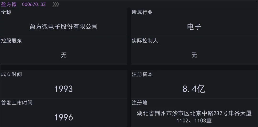 盈方微全称叫做盈方微电子股份有限公司,注册地在湖北省荆州市,股票1996年在深交所上市,公司当前无控股股东和实际控制人,组织形式属于其他内地企业,审计机构是天健会计师事务所。