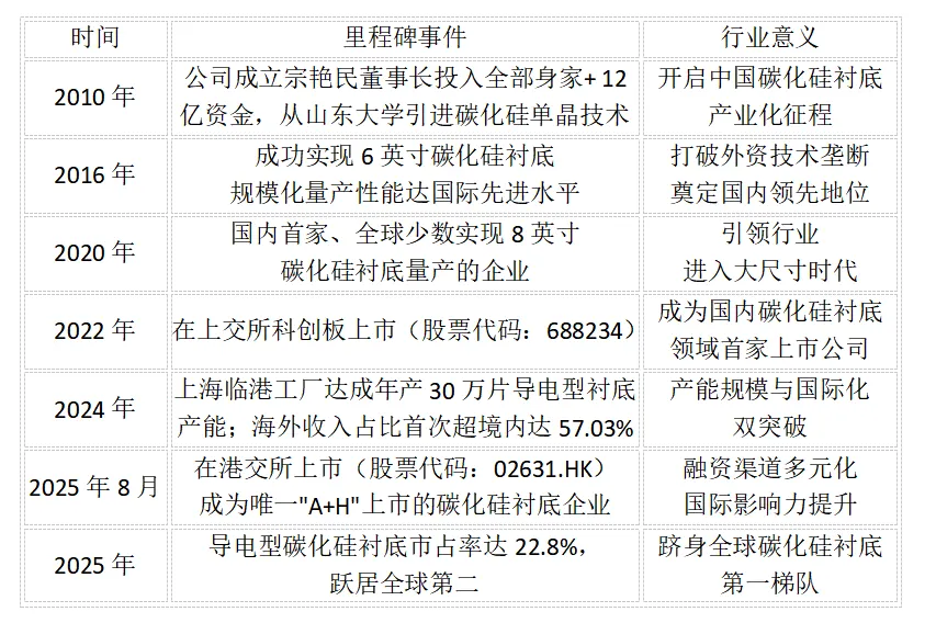 山东天岳先进科技股份有限公司成立于2010年11月2日,总部位于山东济南,是一家专注于宽禁带半导体(第三代半导体)碳化硅衬底材料研发、生产和销售的高新技术企业。关键发展节点: