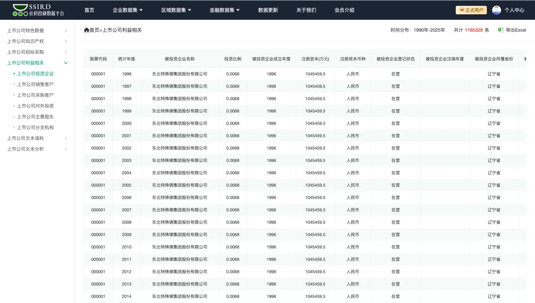 本期,神思数据为大家带来一份上市公司投资科技企业数量的统计数据,为大家研究相关问题提供数据支持。社科投研数据平台(SSIRD数据库)上市公司历年对外投资企业的信息(共计超过116万条)。通过将这些被投资企业进行目前的科技企业类型进行匹配,判断某个被投资企业是否属于科技企业(例如:高新技术企业、企业技术中心、专精特新中小企业、创新型中小企业、科技型中小企业、专精特新“小巨人”企业)。本期,神思数据通过统计各年度各家上市公司对外投资属于科技企业的数量并进行对数化处理,利用该指标可以衡量上市公司科技重视、上市公司科技属性等程度。特提供给神思数据的会员群体使用!由于对本数据的处理较为复杂,在此进行重点说明。我们只获取到被投资企业的成立年度、经营状态、注销年度等信息,无法获取某一家被投资企业具体的被投资年度、以及被认定科技企业的年度。因此处理时,我们设定这样的判定依据:如果某上市公司投资的某一家企业成立于2010年,当前经营状态属于“在营”,且当前或曾经属于任何一类科技企业,我们就将这家被投资企业划分于上市公司2010年-2025年期间对外投资企业的范畴。尽管这样的做法存在一定误差,但目前没有更好的方式。更科学的做法是准确获取被投资企业的被投资年度、被认定科技企业年度的具体信息来进行测算,但显然这几乎是不可能实现的。测算结果