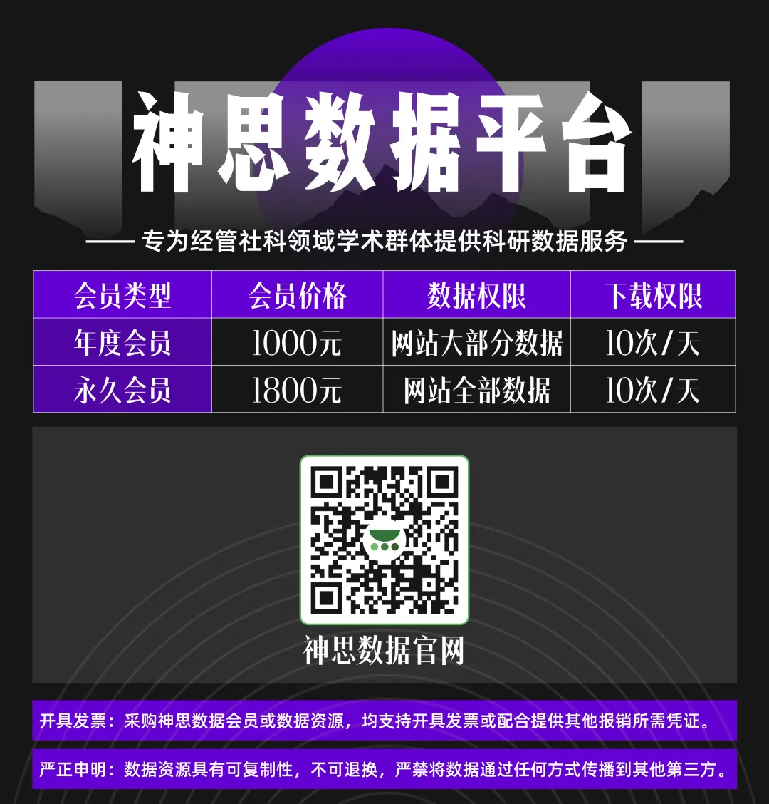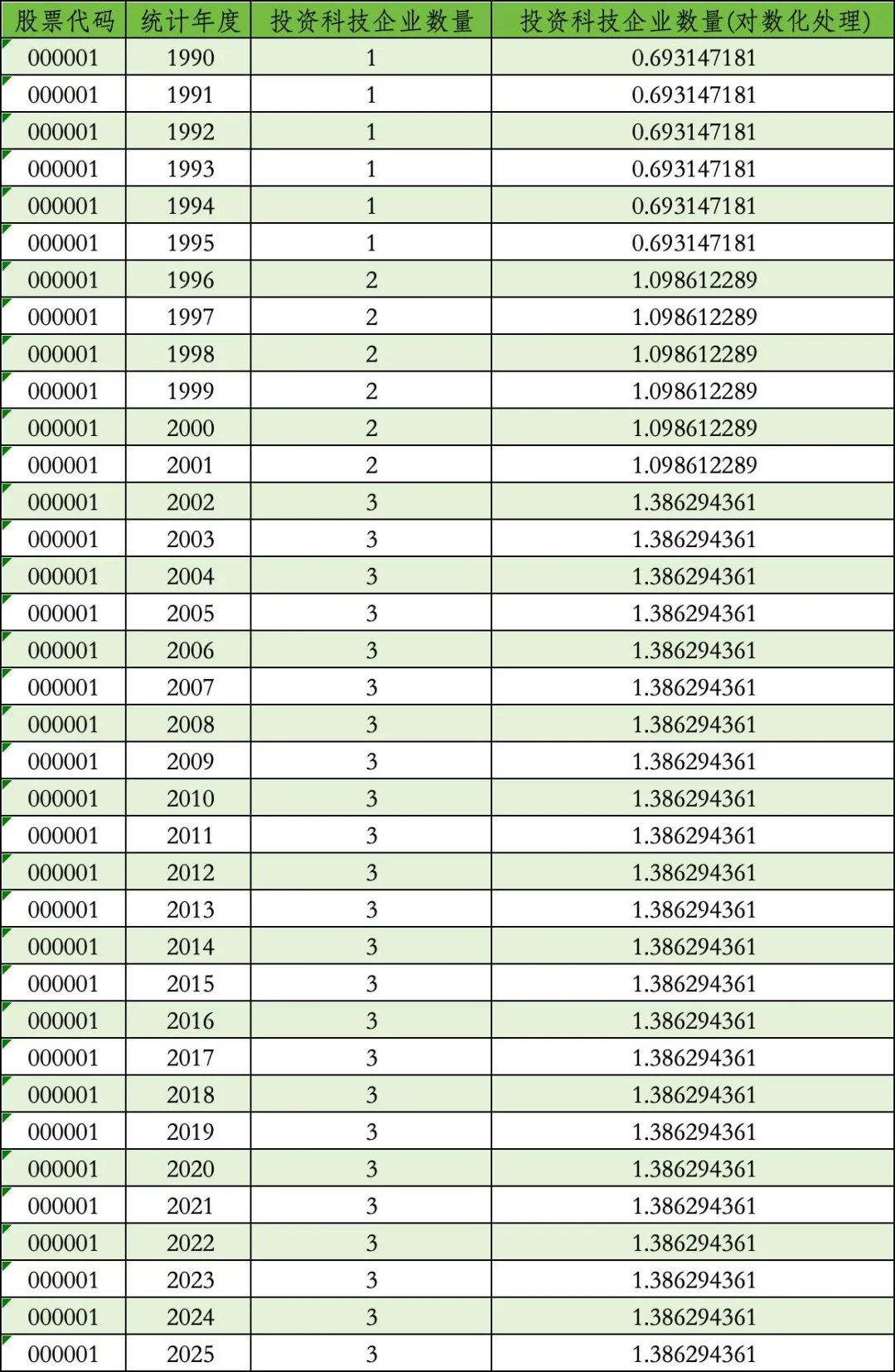 根据上述思路,我们统计了各家上市公司在各年度的科技企业的数量,并进行对数化处理,获得1990年-2025年期间的9.28万条+统计结果,最终的数据预览如下图所示:注意事项:并非每家上市公司或在所有年度都具有科技企业的情况,因此统计结果存在缺失,这属于客观情况,请悉知。存在部分被投资企业属于多种科技企业的情况,对此情况仅计算一次。统计结果已上传至神思数据,欢迎加入会员,即可免费使用!神思数据(https://wz.sensdata.cn)长期专注为经管社科领域学术群体提供数据服务。截至目前,我们已发布多份优质数据资源,满足不同学术群体的科研需求。欢迎采购神思数据库,免费使用海量数据资源。