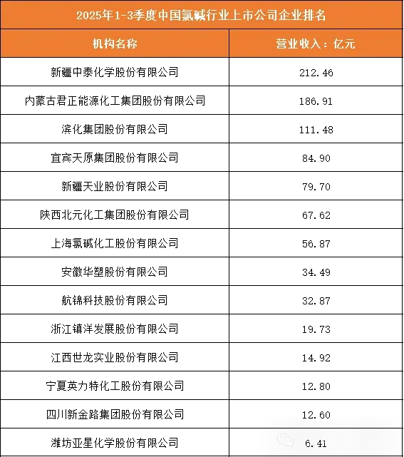 根据申万行业分类,2025年1-3季度中国氯碱行业上市公司按营业收入排名如下:(A股上市公司)