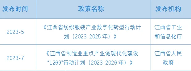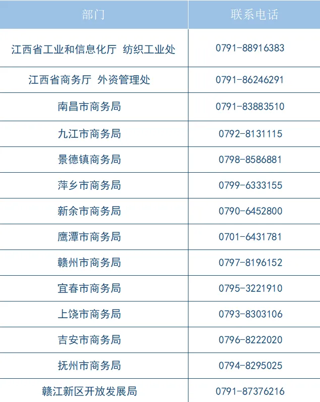 南昌市重点发展针织服装,高档纱线,休闲面料和产业用纺织品等核心产品,努力推进针织服装提质创牌,专业市场建设以及提高印染后整理水平,打造全国针织服装出口基地和休闲面料生产基地;九江市重点发展羽绒服装,粘胶短纤,特种纱线,丝绸家纺和医用纺织品,努力推进服装,棉纺,粘胶纤维和丝绸四大基地建设,形成在全国具有较强竞争力的纺织产业集群;宜春市重点发展新型纱线,再生纤维和服装,加速推进印染集控区建设,打造新兴纺织产业基地;赣州市重点发展女装,胸衣,毛衫,家居服等服装服饰,打造女性服饰特色基地;新余市重点发展麻艺家纺,布艺家纺和高档缝纫线,打造麻纺家纺特色基地;抚州市重点发展棉纺,服装及丝绸产品;吉安市重点发展产业用纺织品和服装;上饶市重点发展服装,家纺,苎麻制品,丝绸等特色产品。