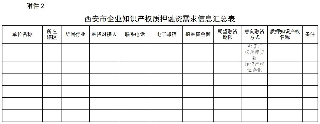 请有意向的企业于截止日期前将《西安市企业知识产权质押融资需求信息填报表》(附件1)加盖公章扫描件及WORD电子版、《西安市企业知识产权质押融资需求信息汇总表》(附件2)WORD电子版发送至指定电子邮箱(邮件主题:企业全称+知识产权质押融资需求信息)。